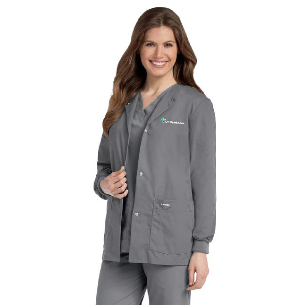 - CHI Health Clinic logo embroidered on the left chest in full color